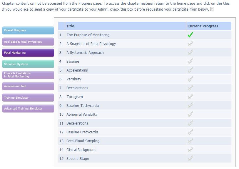 This will take you to your progress page, where you will, by default, have the “Overall Progress” tab selected. Here you can view all completed chapters of the Perinatal Training Program. To obtain a copy of your certificate for each section, you will need to click on the “E-mail Certificate” button for each chapter, located to the right of your completion date.